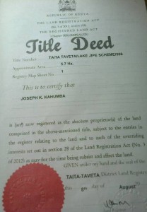 Title Deed – Lake Jipe Martin Tairo Maseghe February 21, 2014 0 Comment Share this:FacebookLinkedInRedditPocketEmailTwitterPrintPinterestTumblr